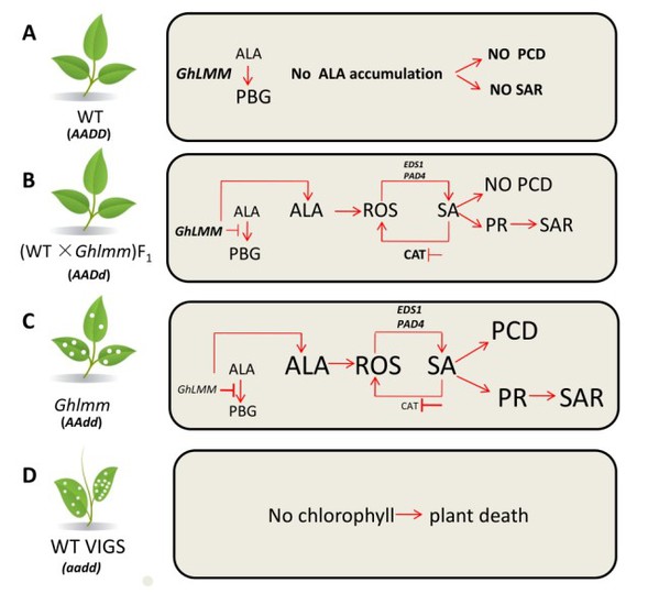 郭旺珍教授团队首次在陆地棉品种中发现了一个类病变突变体,命名为Ghlmm。图位克隆结果表明GhLMM基因编码5-氨基乙酰丙酸脱水酶(ALAD蛋白)。与野生型相比,Ghlmm突变体中GhLMM基因的表达量及ALAD蛋白的酶活性均显著降低,而5-氨基乙酰丙酸(ALA)、ROS及SA的含量均显著增加,病程相关基因的表达量显著提高,对黄萎病的抗性显著增强。同时,体外分子证据及遗传学分析都证实GhLMM基因在调控植物生长发育和抗病之间具有剂量效应。本研究为棉花抗病性的精准调控育种提供了理论基础,为实现基于剂量调控的生长发育与抗性间最佳平衡,提高多倍体作物的抗病性提供了新思路。