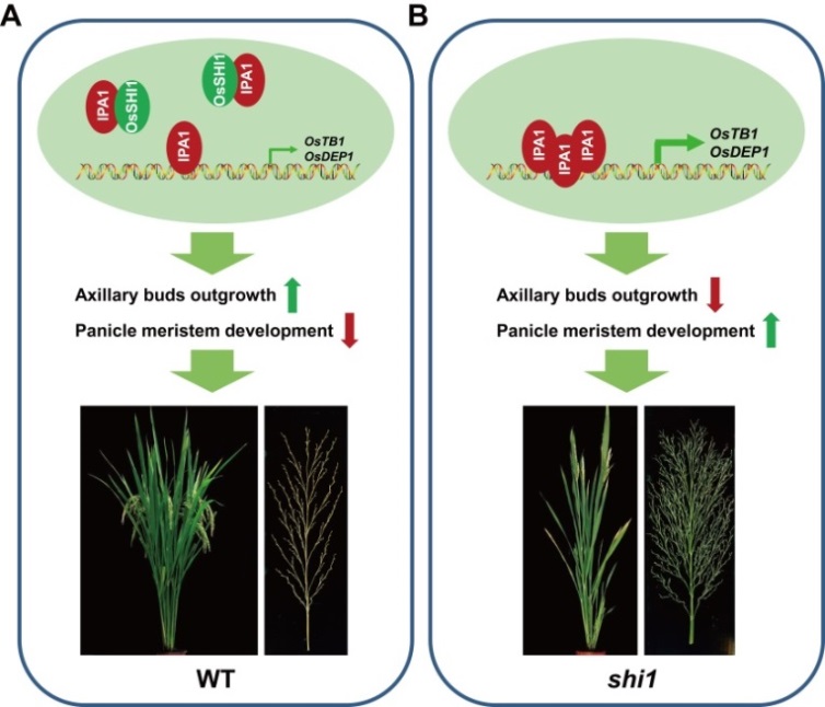 万建民院士课题组研究人员鉴定了一个新的水稻株型发育突变体shi1(shortinternode1),其分蘖数减少、茎秆粗壮并且穗分枝数显著增加。图位克隆结果表明,目的基因OsSHI1编码植物特异转录因子,主要在腋芽及幼穗中表达。研究人员通过酵母双杂交筛库鉴定出了一个重要的互作蛋白,IPA1(即理想株型调控因子OsSPL14)。IPA1对水稻株型发育的调控主要是通过调控下游关键基因OsTB1及OsDEP1来实现。有趣的是,在这两个基因的启动子中均发现OsSHI1识别基序的存在,并且OsSHI1可直接结合OsTB1及OsDEP1的启动子。在突变体shi1中,OsTB1及OsDEP1的表达水平显著上调。进一步研究发现,OsSHI1可降低IPA1对OsTB1及OsDEP1启动子的结合能力并抑制其对下游靶基因的转录激活活性,进而协同调控水稻株型的发育。