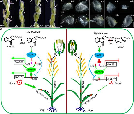 在前期研究中,该团队筛选获得了一个水稻生长素氧化双加氧酶(Dioxygenase for Auxin Oxidation, DAO)失活的dao突变体(Dev Cell, 2013),该突变体在抽穗开花时期不能将有活性的生长素(IAA)氧化成无活性的OxIAA,破坏了体内IAA的动态平衡,出现颖壳不能正常张开、花药不能正常开裂、籽粒不能正常灌浆和单性结实的表型。本研究发现dao突变体由于生长素水平升高导致植株叶片中蔗糖含量增加,但花器官(主要是浆片、花药和子房)中的蔗糖含量却显著降低。对野生型和突变体叶片进行[14C]-蔗糖喂养实验,结果显示在dao突变体叶片中显著积累放射性蔗糖,但在花药和子房中放射性蔗糖却显著减少。RNA-Seq分析显示,在dao突变体浆片中生长素转录因子OsARF18表达上调,而OsARF2表达下调。OsARF18的过表达系或OsARF2敲除系能够再现dao突变体的表型。EMSA实验证明OsARF2 通过直接结合OsSUT1启动子中的糖响应元件(SuRE) 调节OsSUT1的表达,而OsARF18 通过直接结合生长素反应元件AuxRE 或SuRE 抑制OsARF2和OsSUT1 的表达,从而调控蔗糖从源到库的运输。而在dao和Osarf2 突变体中过表达OsSUT1基因,能显著提高突变体颖花张开率和小穗结实率。这些研究结果揭示了IAA-OsARF18-OsARF2生长素信号级联反应调控蔗糖转运子OsSUT1表达,调节蔗糖从源(叶片)到库(浆片、花药和子房)的分配,进而影响水稻颖壳张开、花药开裂和籽粒灌浆结实的分子机制,将为如何协调源-库-流提高农作物产量提供理论依据。