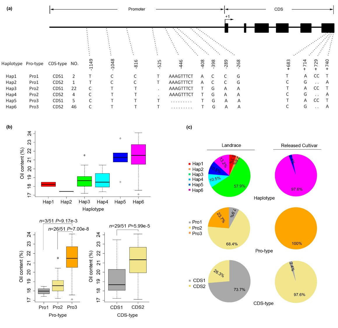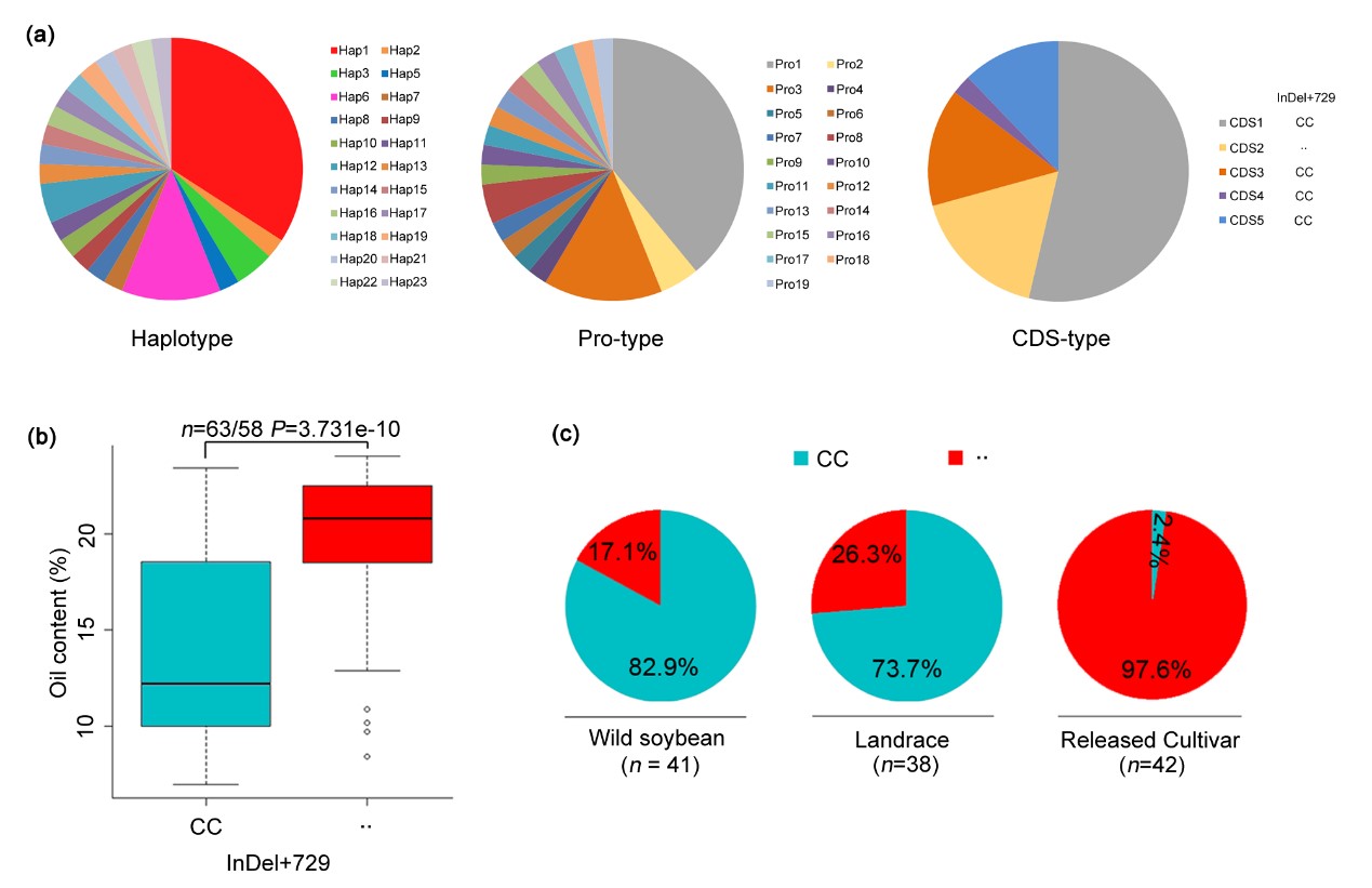 该研究发现大豆基因组中25个位点在从地方品种到育成品种的改良过程中受到强烈选择且位于控制籽粒含油量的QTL区间,其中位于15号染色体的Glyma.15g049200基因在大豆种子中高表达,并且在高油品种中的表达量显著高于低油品种。该基因编码一个糖转运蛋白,被命名为SWEET39 (Sugars Will Eventually be Exported Transporter)。SWEET39基因在栽培大豆中具有三种启动子(Pro)和两种类型编码区(CDS),共形成六种单倍型(Hap),其中含Pro3、CDS2和Hap6类型SWEET39基因的大豆品种籽粒含油量较高,这三种单倍型对油脂含量的影响分别通过转基因拟南芥、大豆发根和大豆重组自交系得到验证。进一步分析发现,SWEET39的优异单倍型在栽培大豆中的频率高于野生大豆,但野生大豆中具有更加丰富的单倍型(22种Hap、19种Pro和5种CDS)。综上所述,大豆SWEET39的序列变异影响了其基因表达水平和籽粒含油量,且该基因在大豆驯化和改良过程中受到强烈的选择,在育成大豆品种中含有较高频率的优异SWEET39单倍型。了解SWEET39基因在不同大豆材料中的自然变异类型对培育高油大豆品种具有重要指导意义。