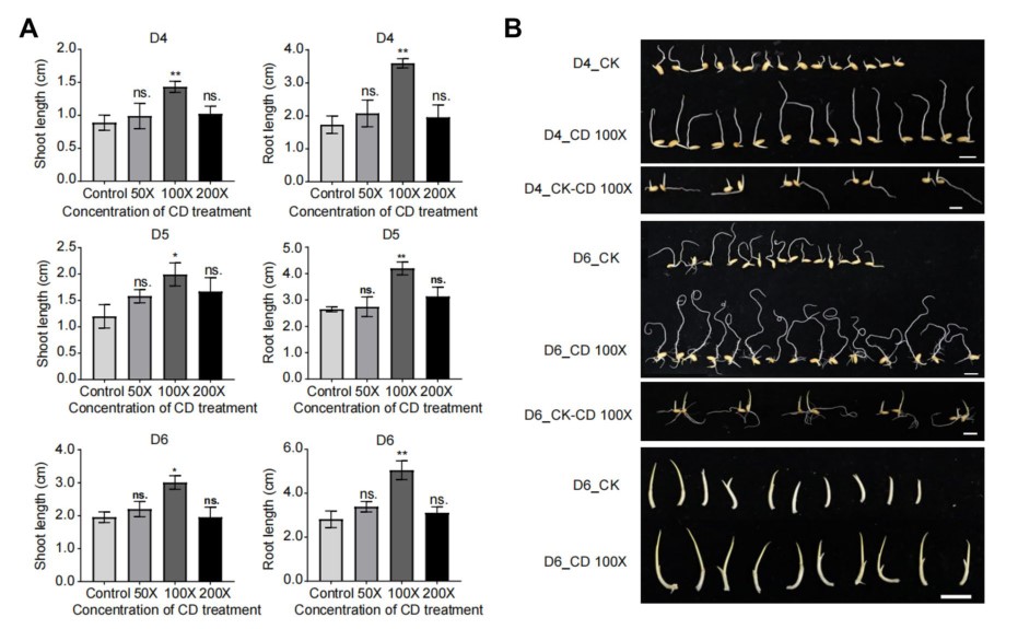 纳米材料已广泛应用于工业及医疗医药行业,而其在农业生产中的应用正受到广泛关注。目前,一种直径为2-5 nm的碳点(Carbon dots, CDs)纳米颗粒被认为是生物安全且环境友好型材料,在农业上具有潜在应用价值。已有研究表明,CDs能够影响植物生长发育,但其调控机制还有待进一步研究。本研究发现,适宜浓度的CDs预处理水稻种子明显促进了其根系及芽的生长。根系转录组分析结果表明,CDs处理诱导了根系部分生长发育以及激素通路相关基因的转录重编程;进一步实验证明,CDs处理影响了生长素在根中的活性及其空间分布,这些变化可能与CDs诱导的根表型变化有关。本研究为CDs如何通过转录重编程调控植物生长发育提供了一些新的见解。