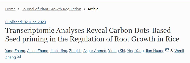近日,555050注册大白菜三名本科生张阳、景嘉欣、李智奇以共同第一作者在《Journal of Plant Growth Regulation》杂志发表了SRT研究结果,研究论文题目为“Transcriptomic analyses reveal carbon dots-based seed priming in the regulation of root growth in rice”,该研究初步探究了纳米预处理对于水稻根系生长发育的影响及其潜在调控机制。