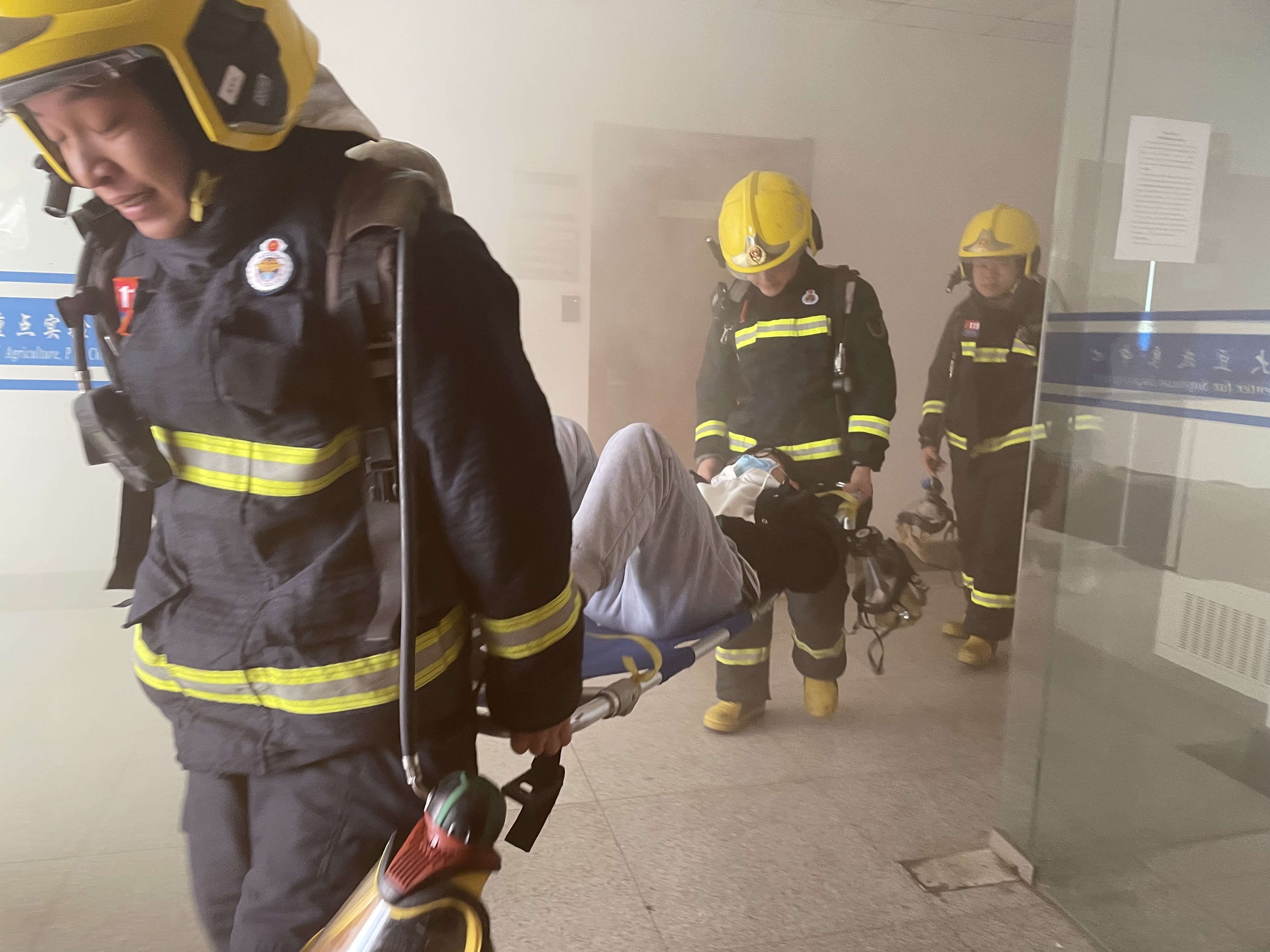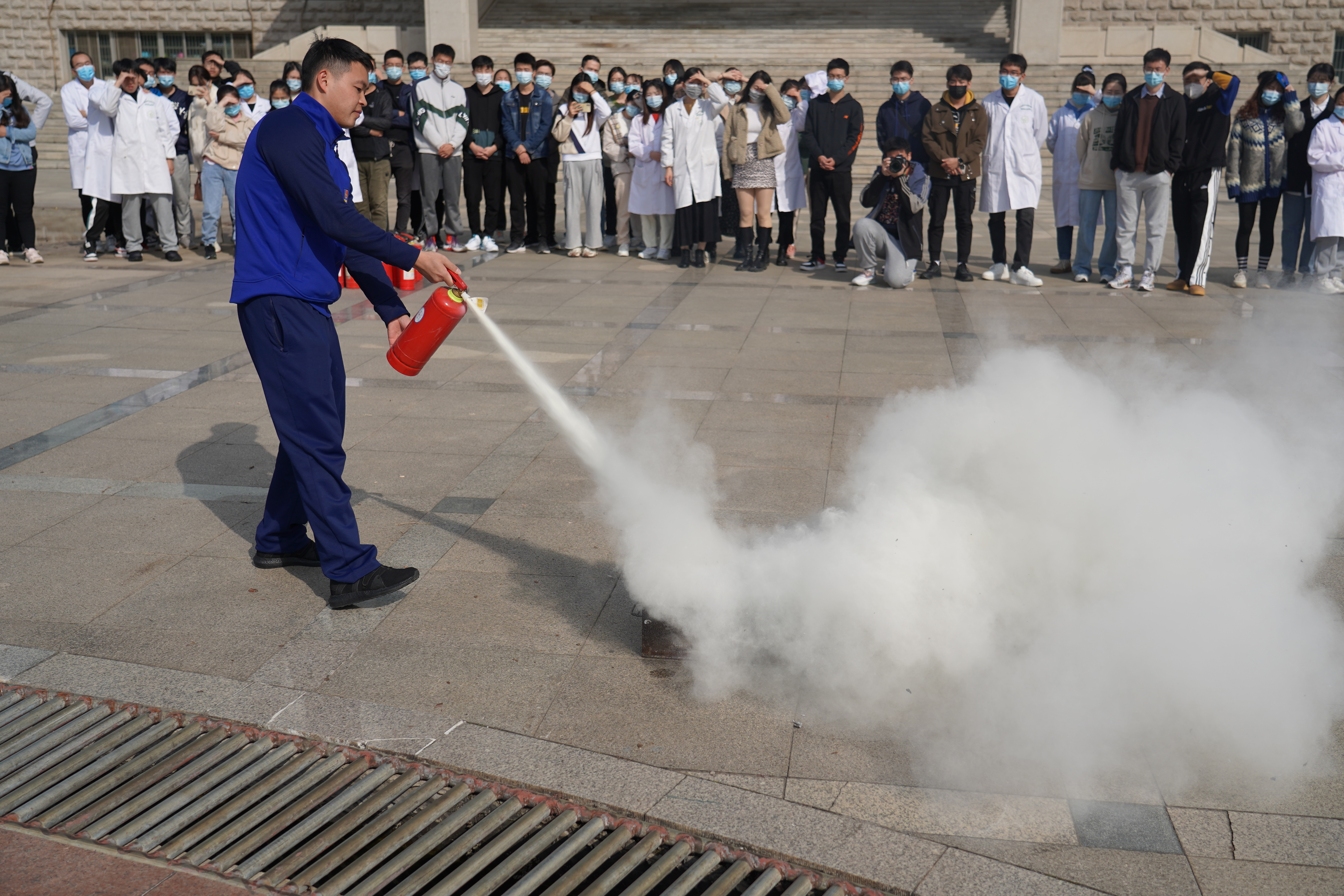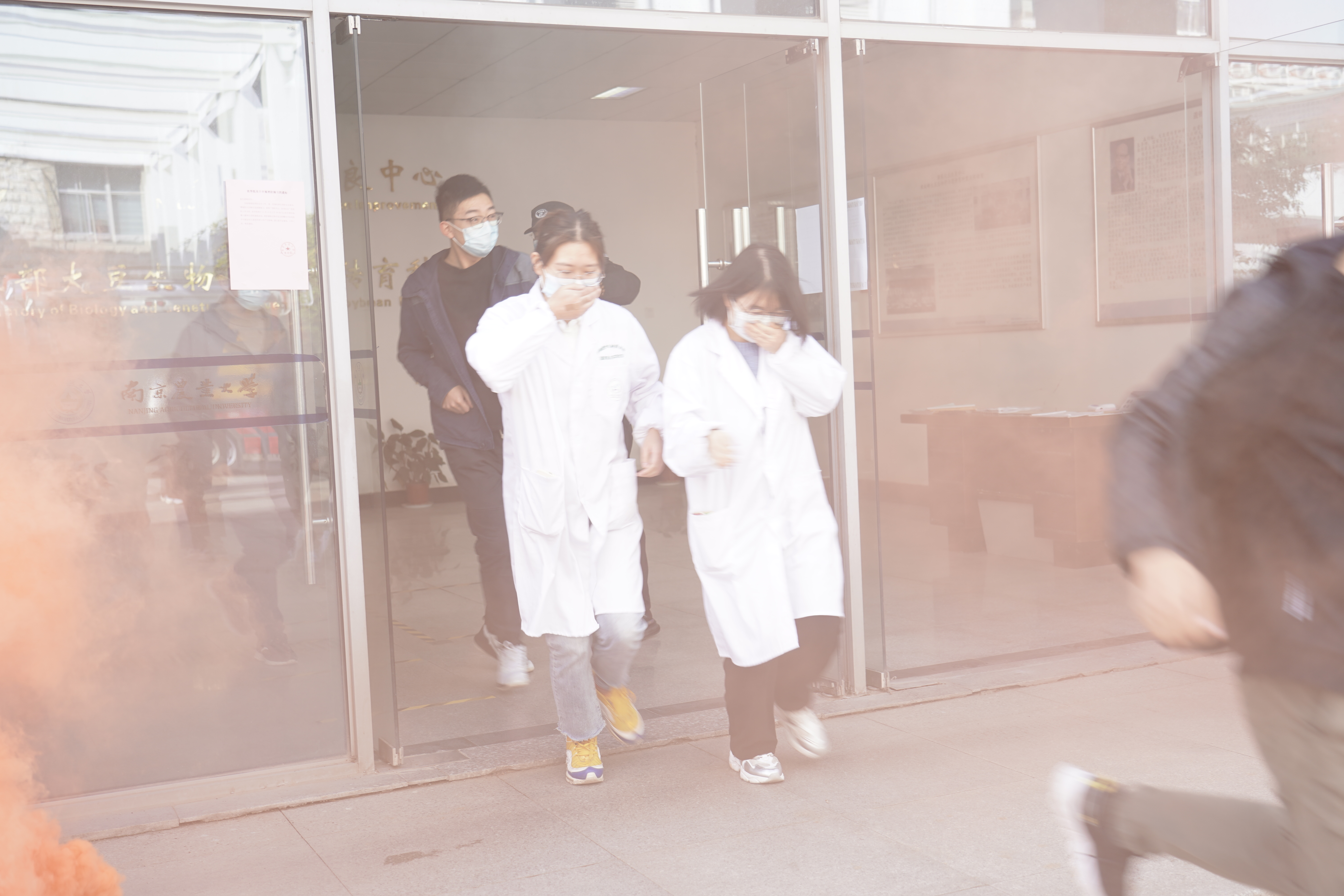 演练之前,学院对演练进行了精心策划和严密组织,明确了演练步骤、疏散路线。上午10时,随着烟饼的点燃、警报的响起,各实验室师生在工作人员的指挥下,按照指定路线,躬着腰,用手、袖口捂住口鼻,迅速有序地进行紧急疏散。全体师生很快便撤离到安全地带。