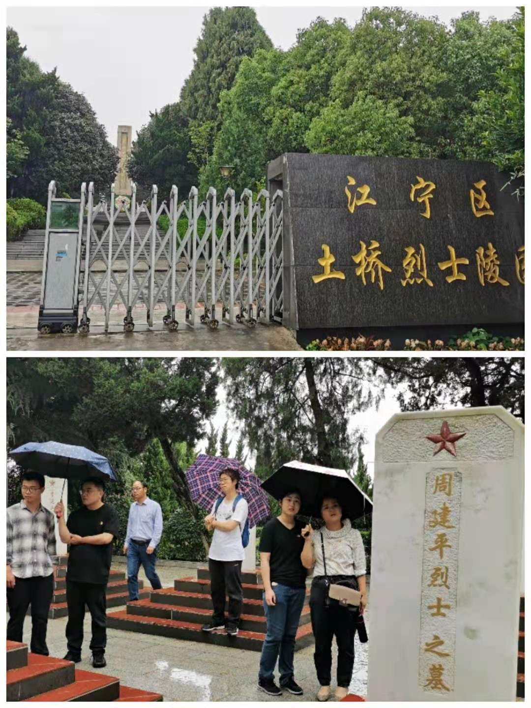 抗战时期,江宁县是新四军创建茅山抗日根据地的重要组成部分。1938 年六七月间,新四军第一支队由皖南开赴苏南敌后,开展抗日游击战争,在江宁县东南部以郭庄为中心的江宁、溧水、句容三县交界地区,建立了中共江溧句县委(后改为中共江宁县委)。其间,先后有江宁县抗日民主政府和新四军的邰贤聚等十几名同志,在江宁的上合、西城、祝庄等地领导人民群众开展抗敌斗争中英勇牺牲。新中国成立后,江宁县人民政府为纪念抗日牺牲的烈士,于1977 年在土桥乡柏墅村修建烈士墓,内有邰贤聚、周建平、周喆(女)、李贯一、程水泉、周志明、纪耀会和新四军龚绪祥排长、李延井班长等9 名烈士。1978 年,又将在抗战时期牺牲的邰贤金、孙志金以及新四军杨班长等5 名烈士移至该陵园,并修建了抗日烈士纪念碑。土桥烈士陵园由1 座纪念碑和11 座烈士墓组成。虽然当时天下雨,全体支部党员依然前往烈士纪念碑举行了凭吊仪式,重温入党誓词。