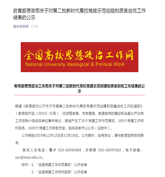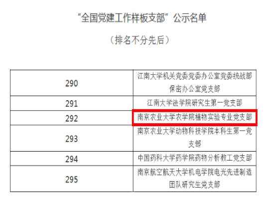 近日,教育部办公厅为深入贯彻落实习近平新时代中国特色社会主义思想和党的十九大精神,深刻学习领会全国教育大会、全国高校思想政治工作会议、学校思想政治理论课教师座谈会精神,结合“不忘初心、牢记使命”主题教育,面向全国高校培育创建10所党建工作示范高校、100个党建工作标杆院系、1000个党建工作样板支部。根据《教育部办公厅关于开展第二批新时代高公司党建示范创建和质量创优工作的通知》(教思政厅函〔2019〕15号),经资格审查、专家推荐、教育部党的建设和全面从严治党工作领导小组成员单位集中审议,公司植物实验专业党支部获评“全国党建工作样板支部”。