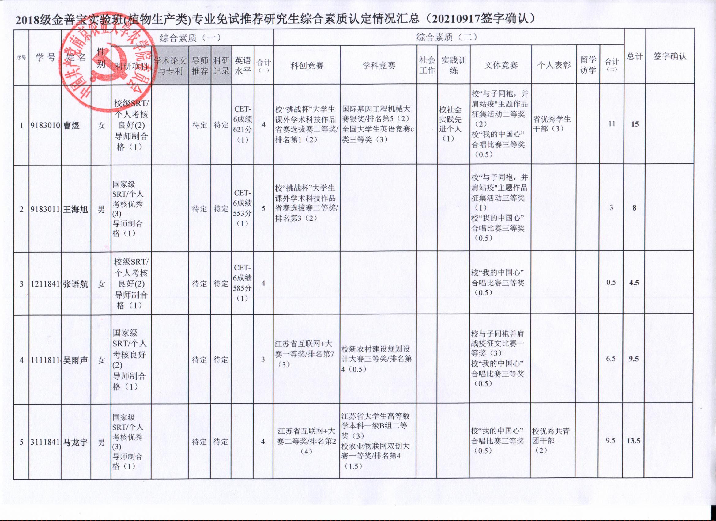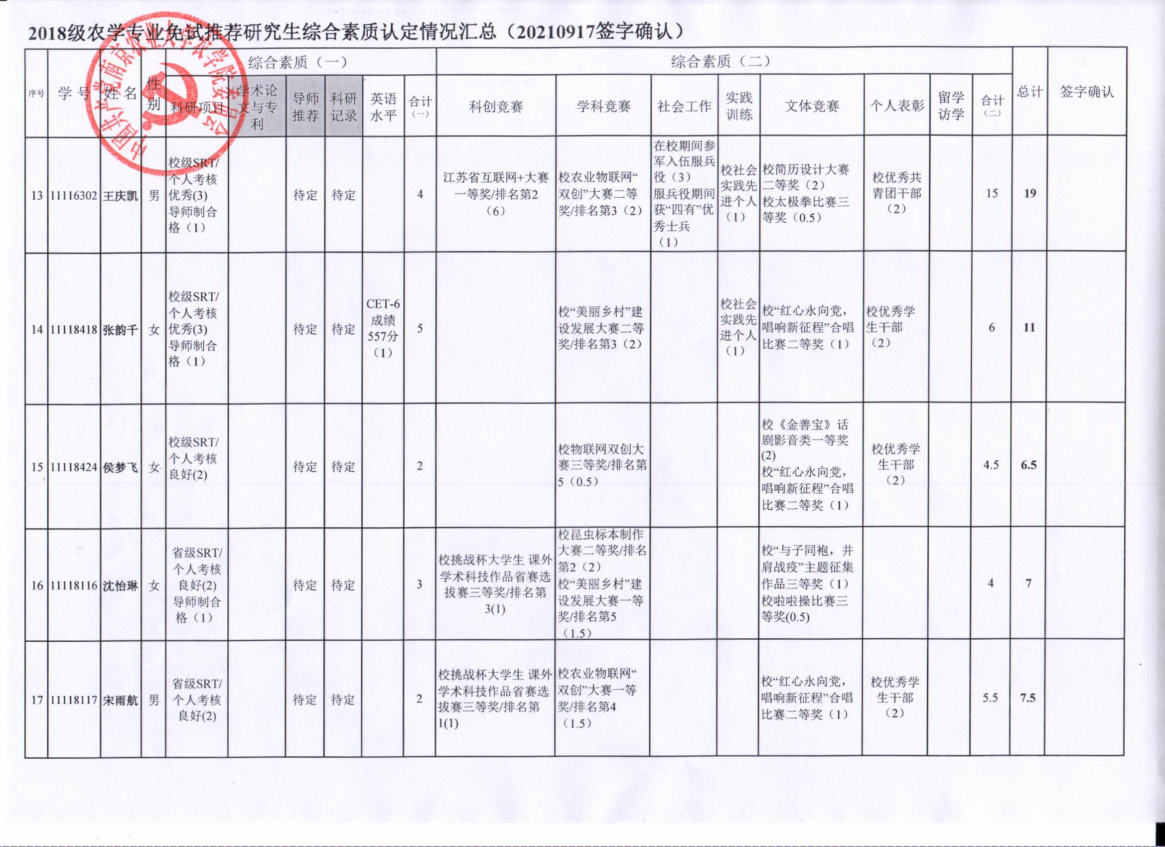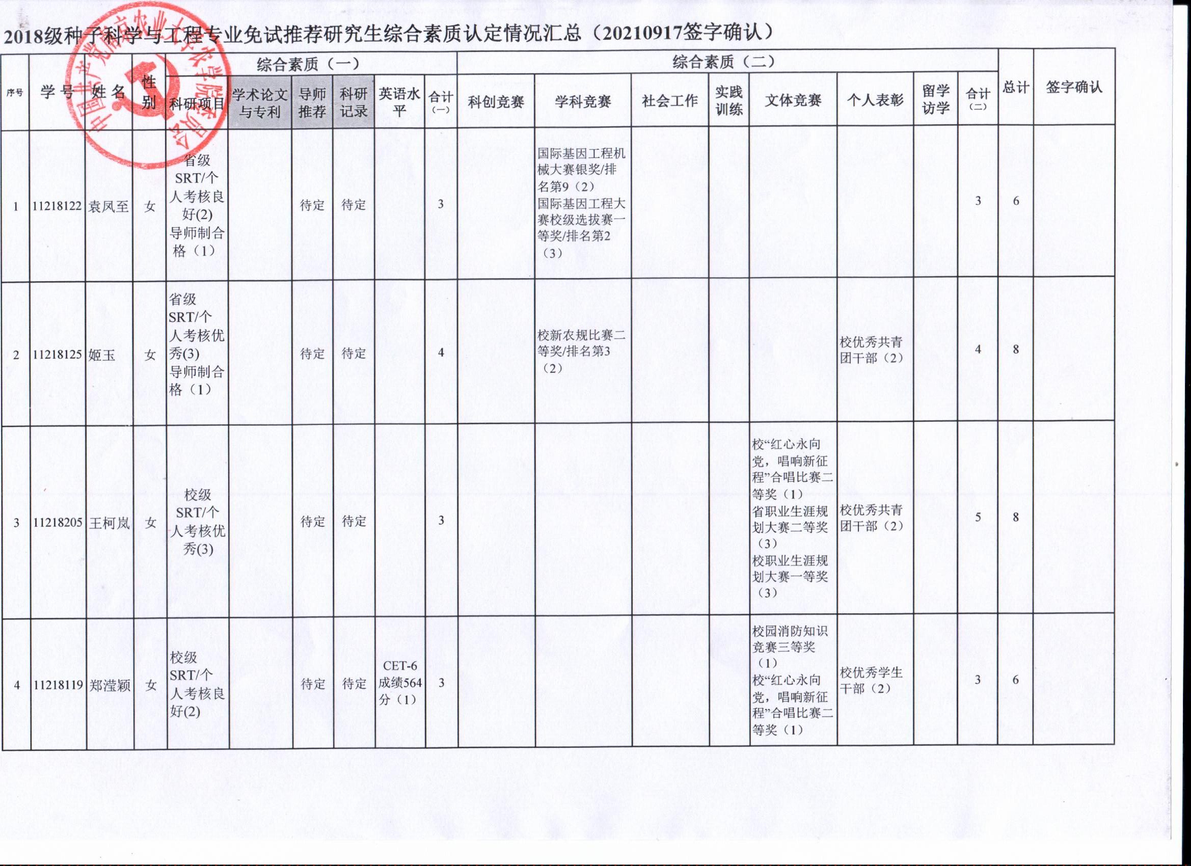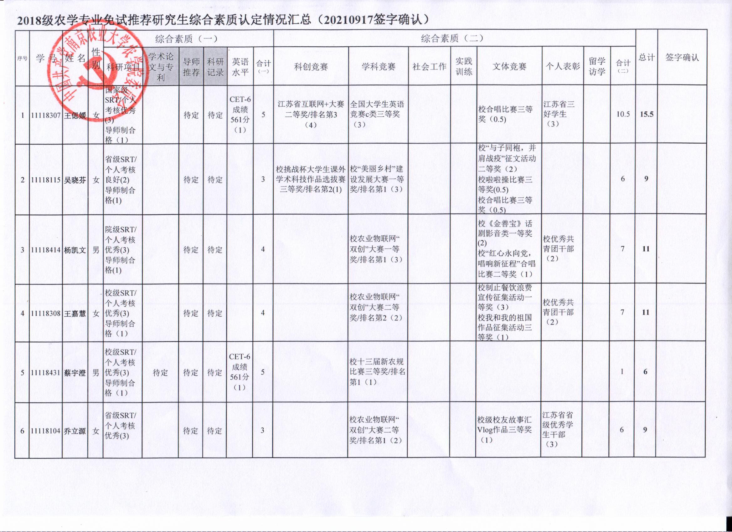 根据学院《关于2022年推荐优秀应届本科毕业生免试攻读研究生工作方案》精神,经员工自愿申请、学院审核及员工签字确认,综合素质(一)第一、五类与综合素质(二)所有类别得分情况已于9月17-19日进行公示,现予以再次公示。
