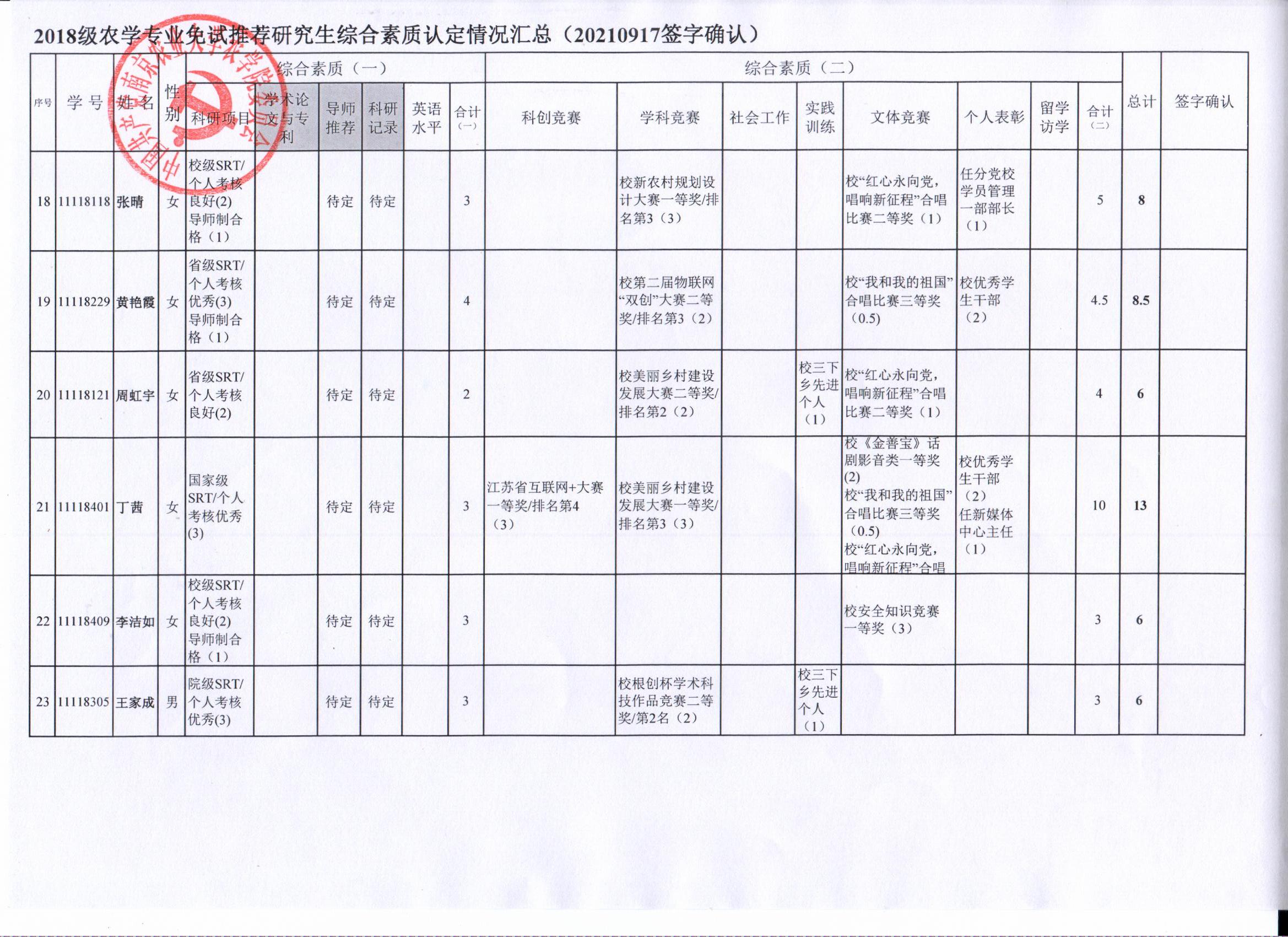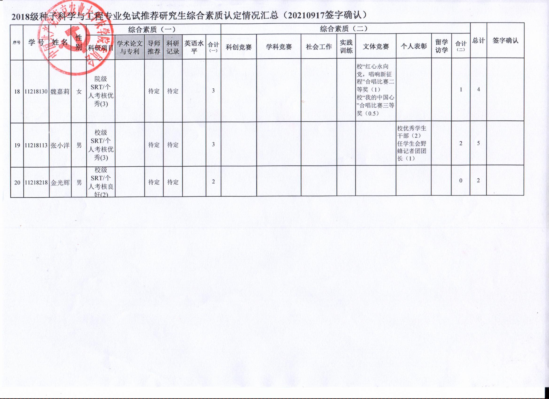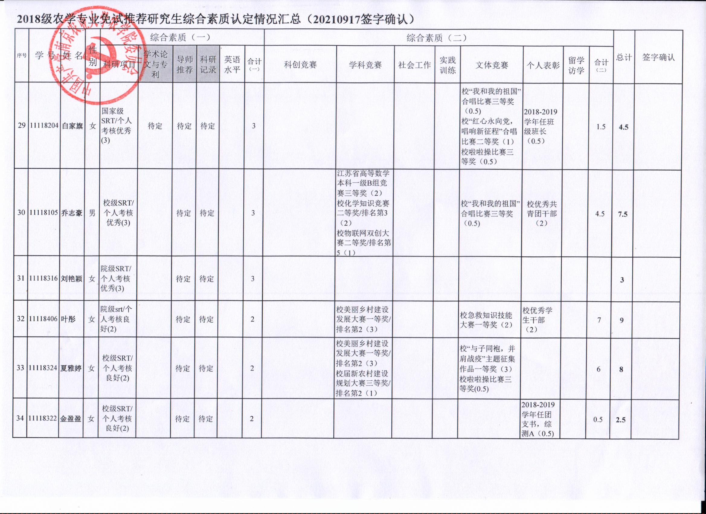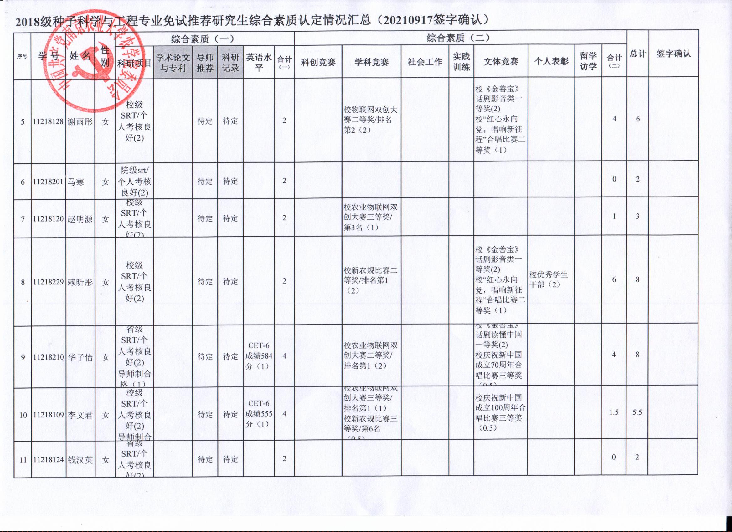 根据学院《关于2022年推荐优秀应届本科毕业生免试攻读研究生工作方案》精神,经员工自愿申请、学院审核及员工签字确认,综合素质(一)第一、五类与综合素质(二)所有类别得分情况已于9月17-19日进行公示,现予以再次公示。