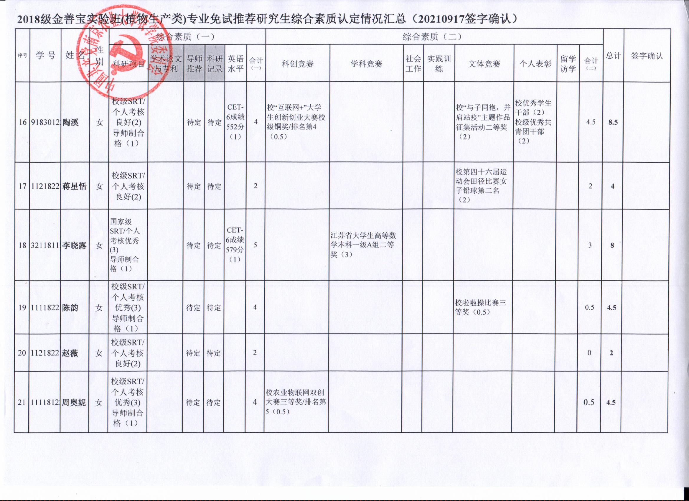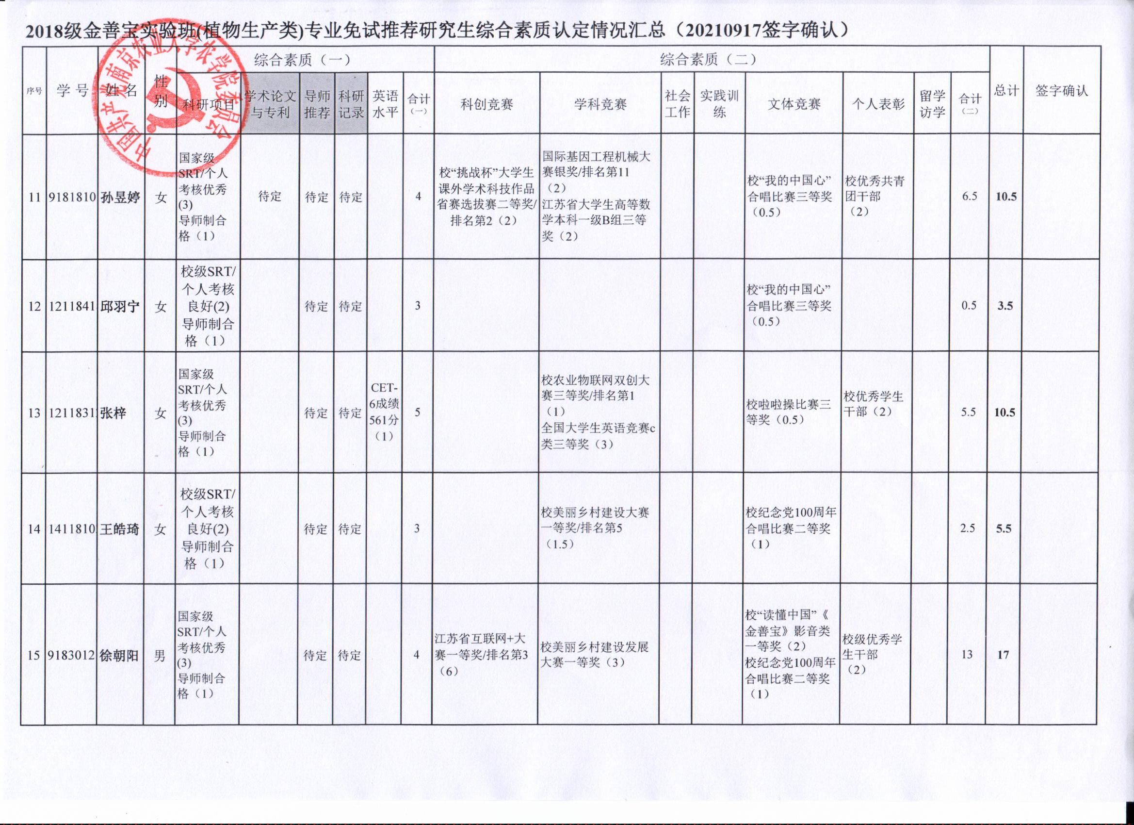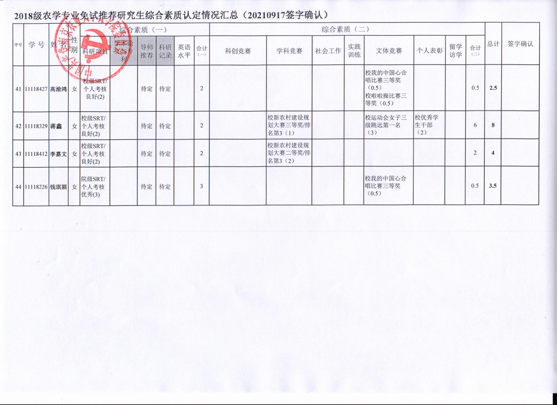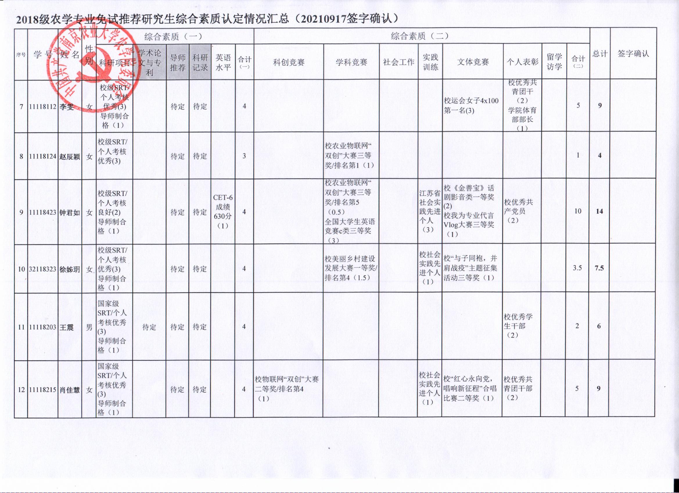 根据学院《关于2022年推荐优秀应届本科毕业生免试攻读研究生工作方案》精神,经员工自愿申请、学院审核及员工签字确认,综合素质(一)第一、五类与综合素质(二)所有类别得分情况已于9月17-19日进行公示,现予以再次公示。