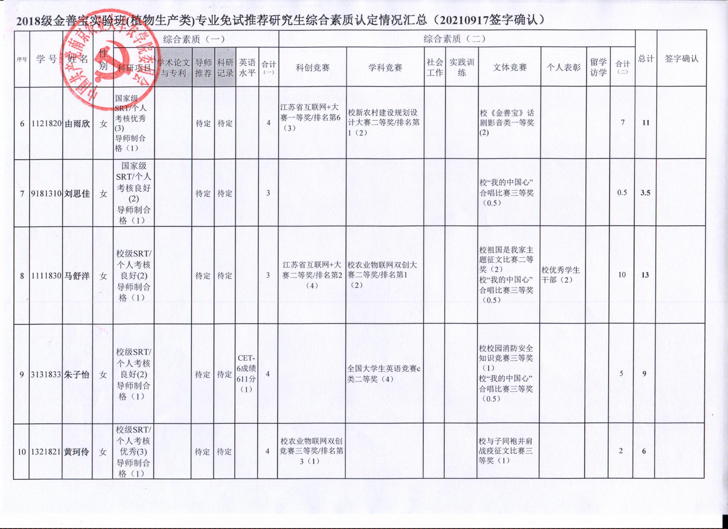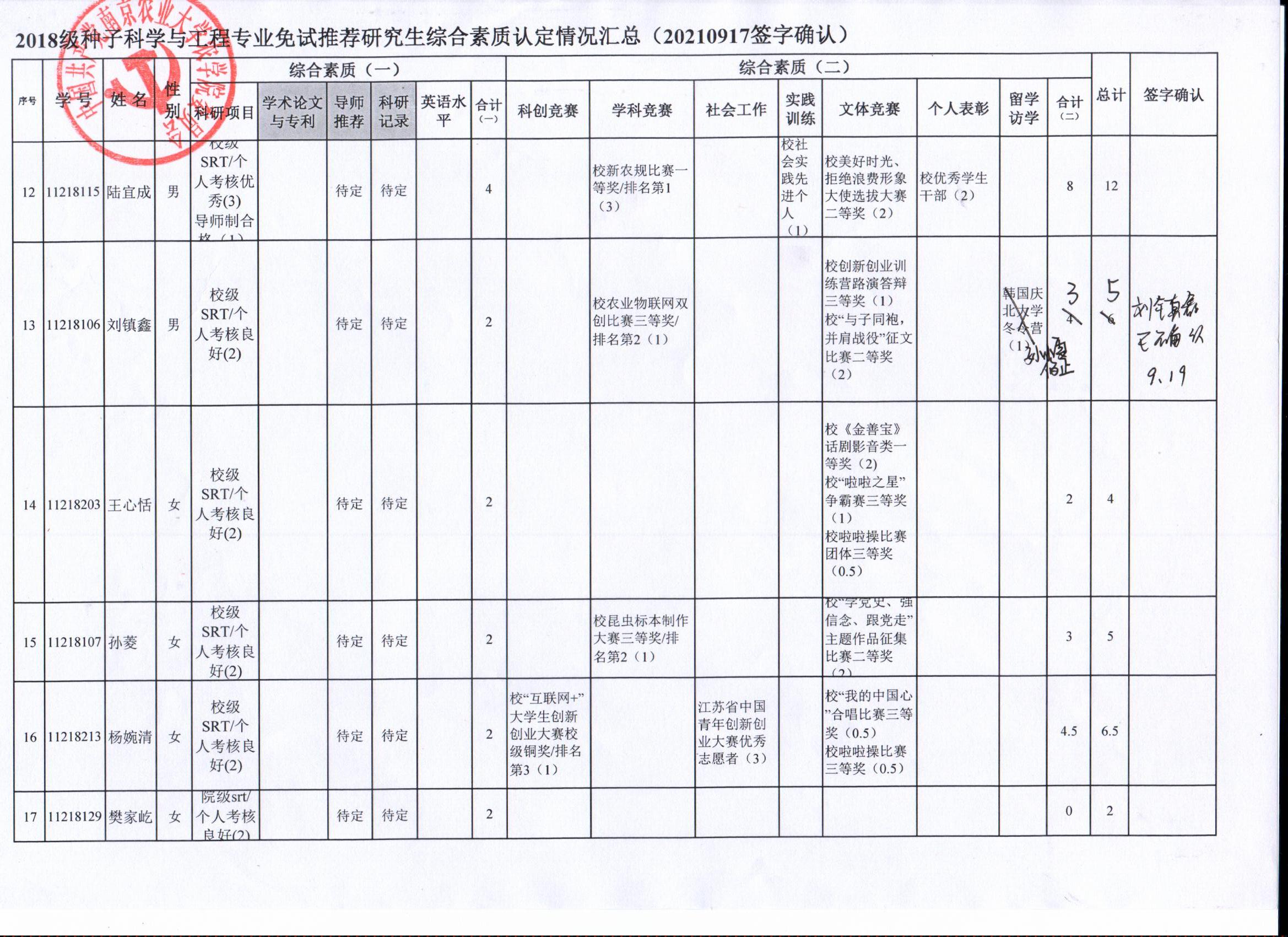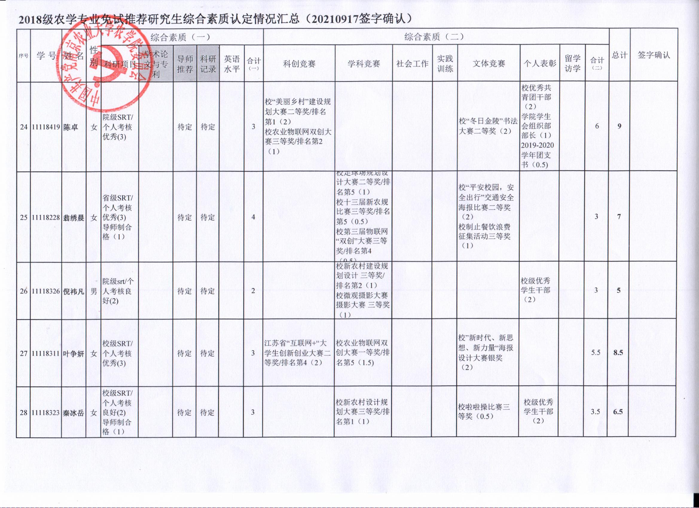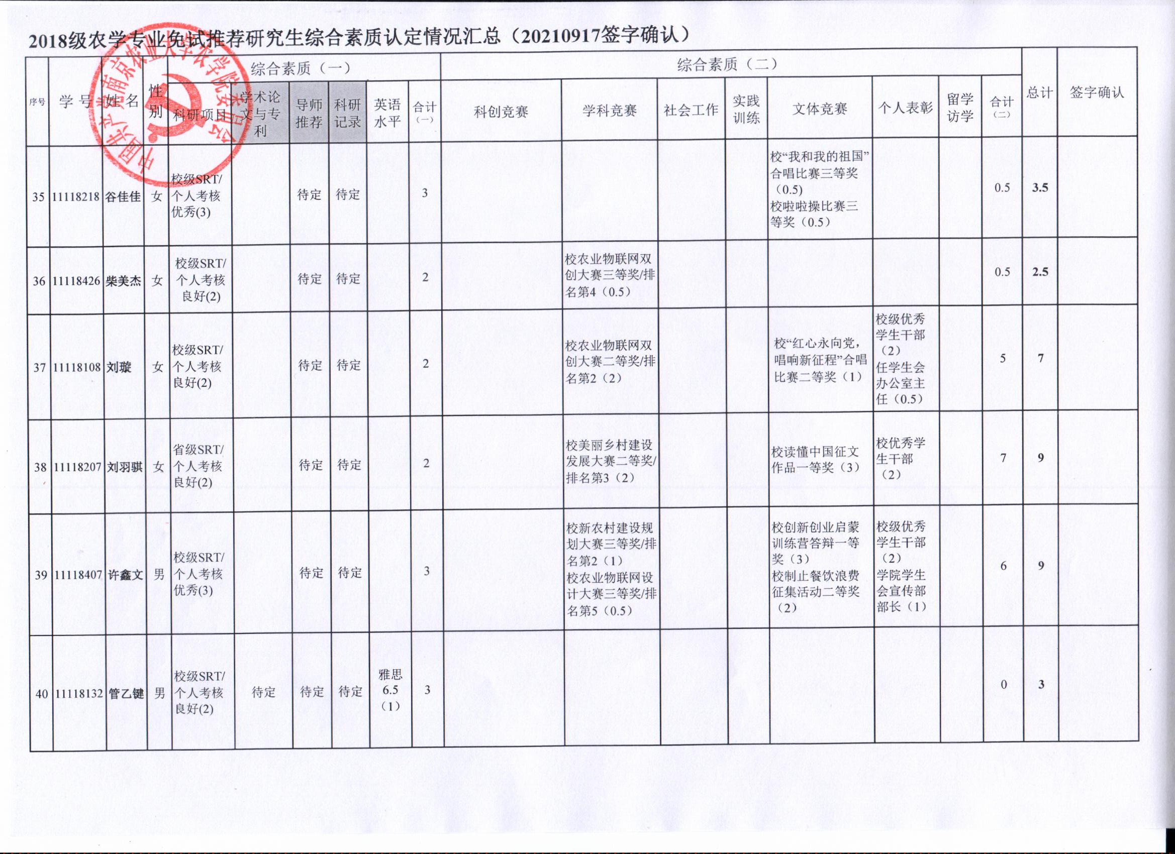 根据学院《关于2022年推荐优秀应届本科毕业生免试攻读研究生工作方案》精神,经员工自愿申请、学院审核及员工签字确认,综合素质(一)第一、五类与综合素质(二)所有类别得分情况已于9月17-19日进行公示,现予以再次公示。