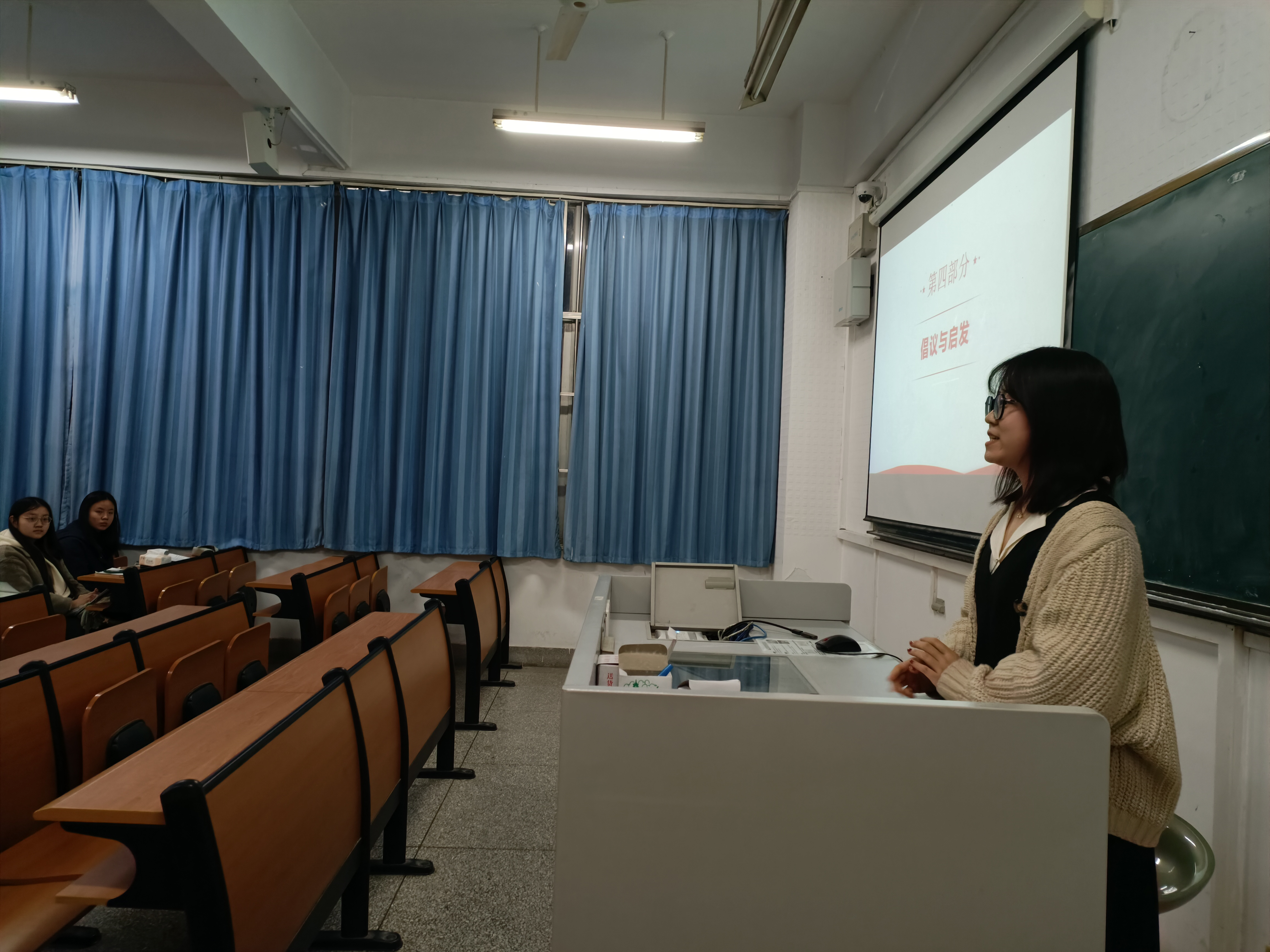 接下来,徐新阳同学重点为大家阐述了党的精神内核。徐新阳同学认为,从历史和实践的角度出发,中国共产党的伟大精神可以看作是由一个个鲜明具体的“坐标”如红船精神、井冈山精神、长征精神等组成,进而形成了一个可以长久涵养后人的“精神谱系”。他随后向大家分享了云南省丽江华坪女子高级中学党支部书记张桂梅同志的事迹,让大家进一步感受到中国共产党人一直在用实际行动履行“全心全意为人民服务”的宗旨。此外,他还介绍了党的方针中的“惠民政策”“乡村振兴”“人民当家做主”和“共同富裕”四个板块,带领大家更深入地感悟党的精神内核。