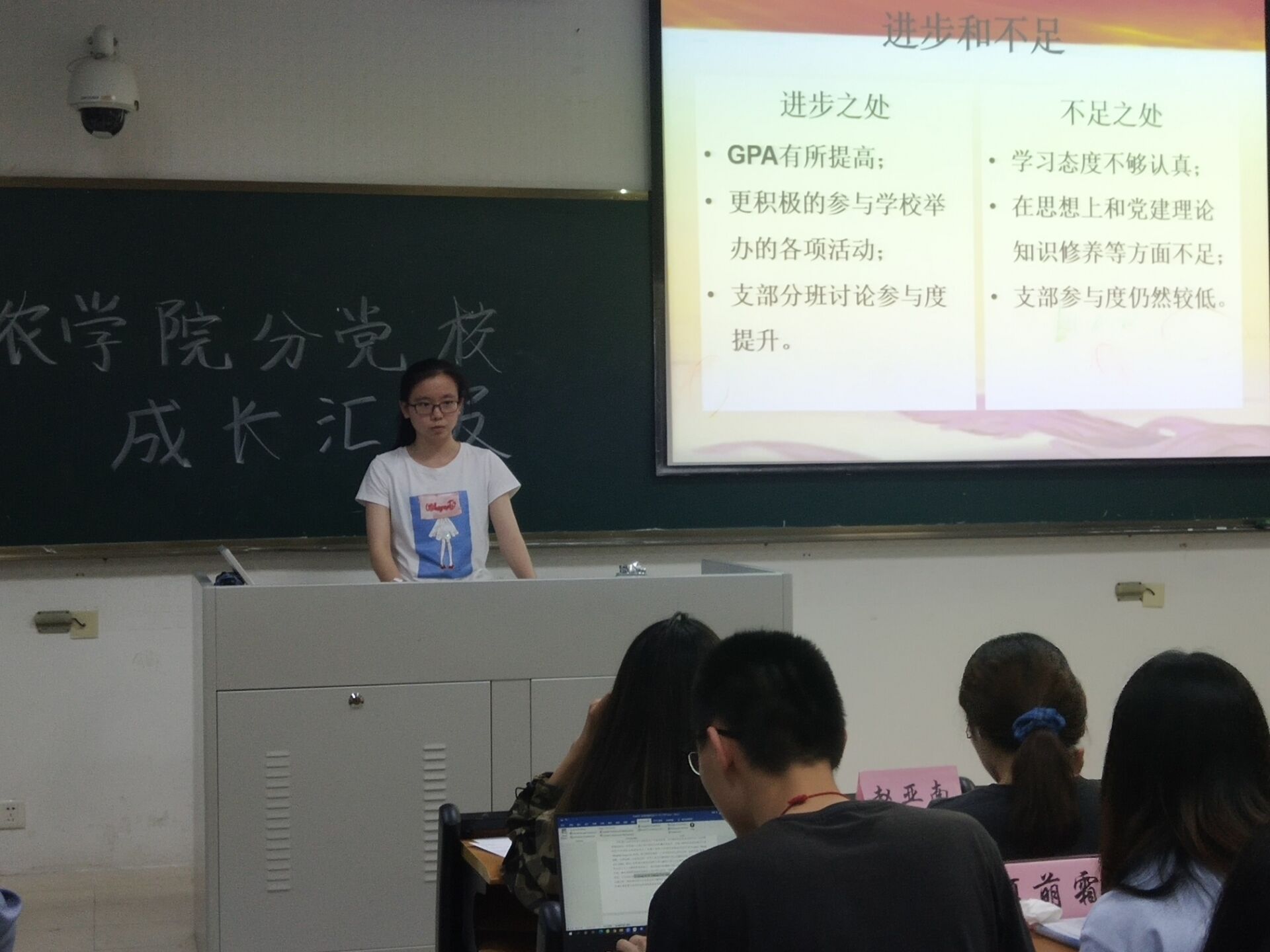 本次成长汇报会分为3分钟的PPT汇报展示环节和2分钟的提问环节2个部分。在PPT展示环节,预备党员们就自己成为预备党员后近一年来对党的理论学习和个人实践方面的变化和成长做了总结汇报。入党积极分子就自己的个人情况、入党动机、学习生活等方面介绍了自己成为积极分子以来的收获和反思,展示了自己的成长心得。在提问环节,各支委考察了大家对党史党章的学习、时事政治的了解程度,并提出了针对性的意见与建议。