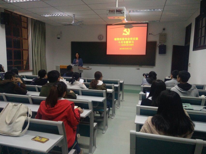 2018年10月27日,植物实验专业党支部在主楼304召开“改革开放40周年”十月专题学习讨论,本次支部分班讨论分别邀请支部成员孙毓琳、朱慧、贺子欣、王宁、石姜懿、卢一帆就改革开放40周年标志性事件进行阐述,反映了改革开放以来我国在教育、文化、食物方面的变化,践行“实践是检验真理的唯一标准”,表明改革开放带领人民生活跃进新天地。
