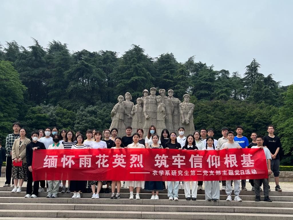 为深入开展学习贯彻习近平新时代中国特色社会主义思想主题教育,牢牢把握“学思想、强党性、重实践、建新功”的总要求,进一步传承革命精神,缅怀为国捐躯的革命先烈,引导青年学子坚定对马克思主义的信仰,强化爱党爱国、艰苦奋斗的意识,农学系研究生第二支部于5月20日上午组织支部全体党员和积极分子前往雨花台烈士陵园,开展以“缅怀雨花英烈 筑牢信仰根基”为主题的党日活动,深切缅怀为中国解放事业牺牲的革命先烈。