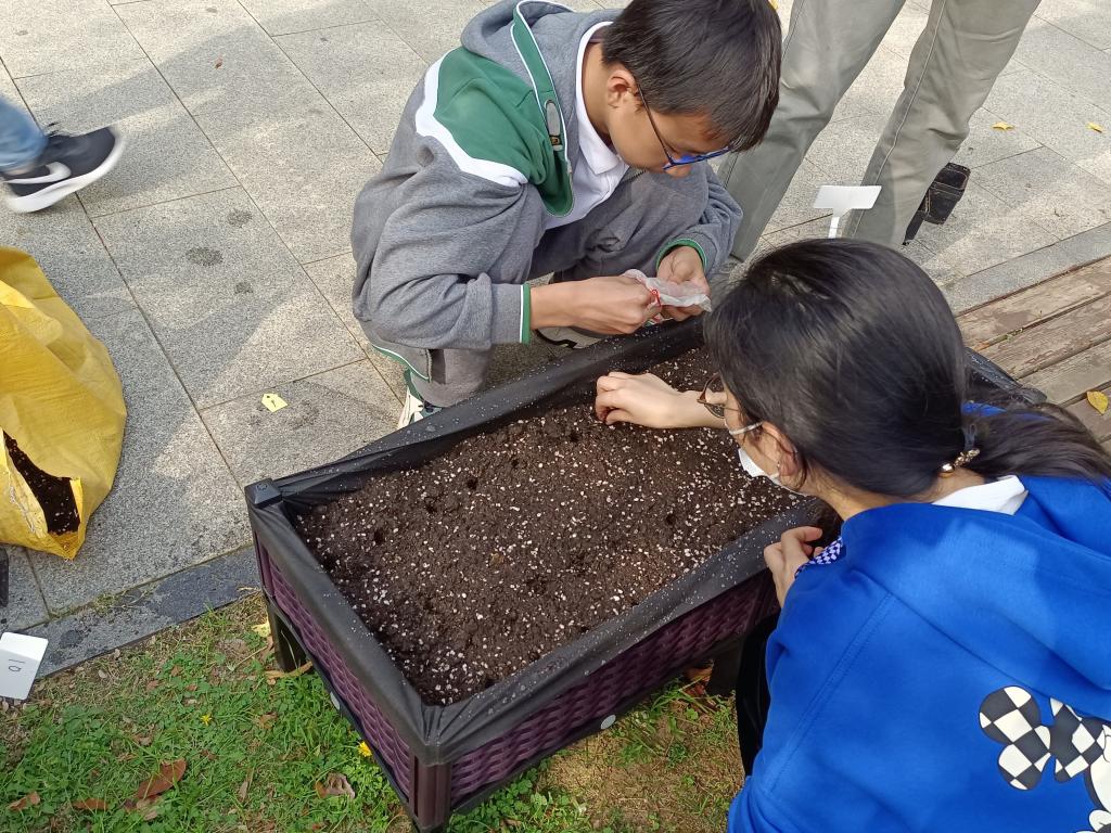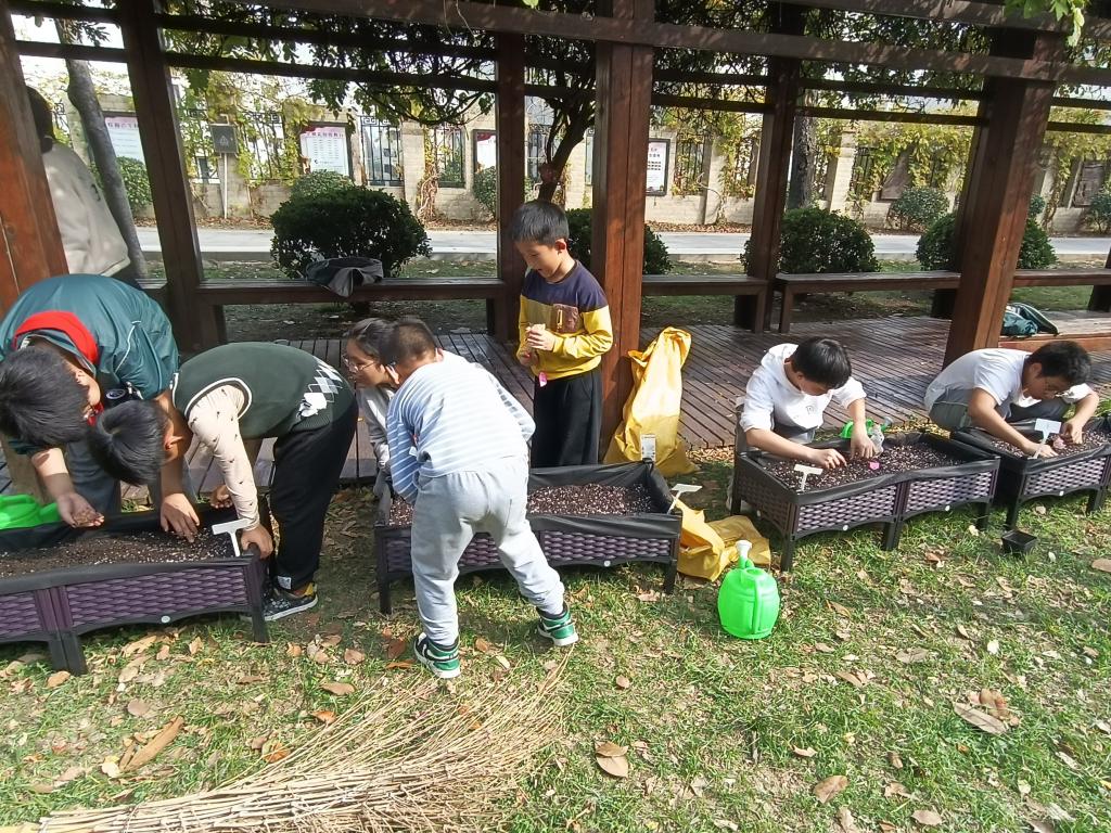 在种植劳动教育中,志愿者带领同学们共种植了12组小麦。经过浸种、催芽等步骤后,同学们在种植箱中用点播的方式进行了播种。不料播种后的半周恰逢南京降温,连连阴雨。播种后的那次活动,同学们赶忙拉着志愿者去看看他们的小芽,生怕它们经不起风吹雨打。同学们说种植小麦让他们变得时时刻刻都在关注天气,有时间就想去种植园溜达一圈看看自己的苗,可算是体会到了农民伯伯们的心情。
