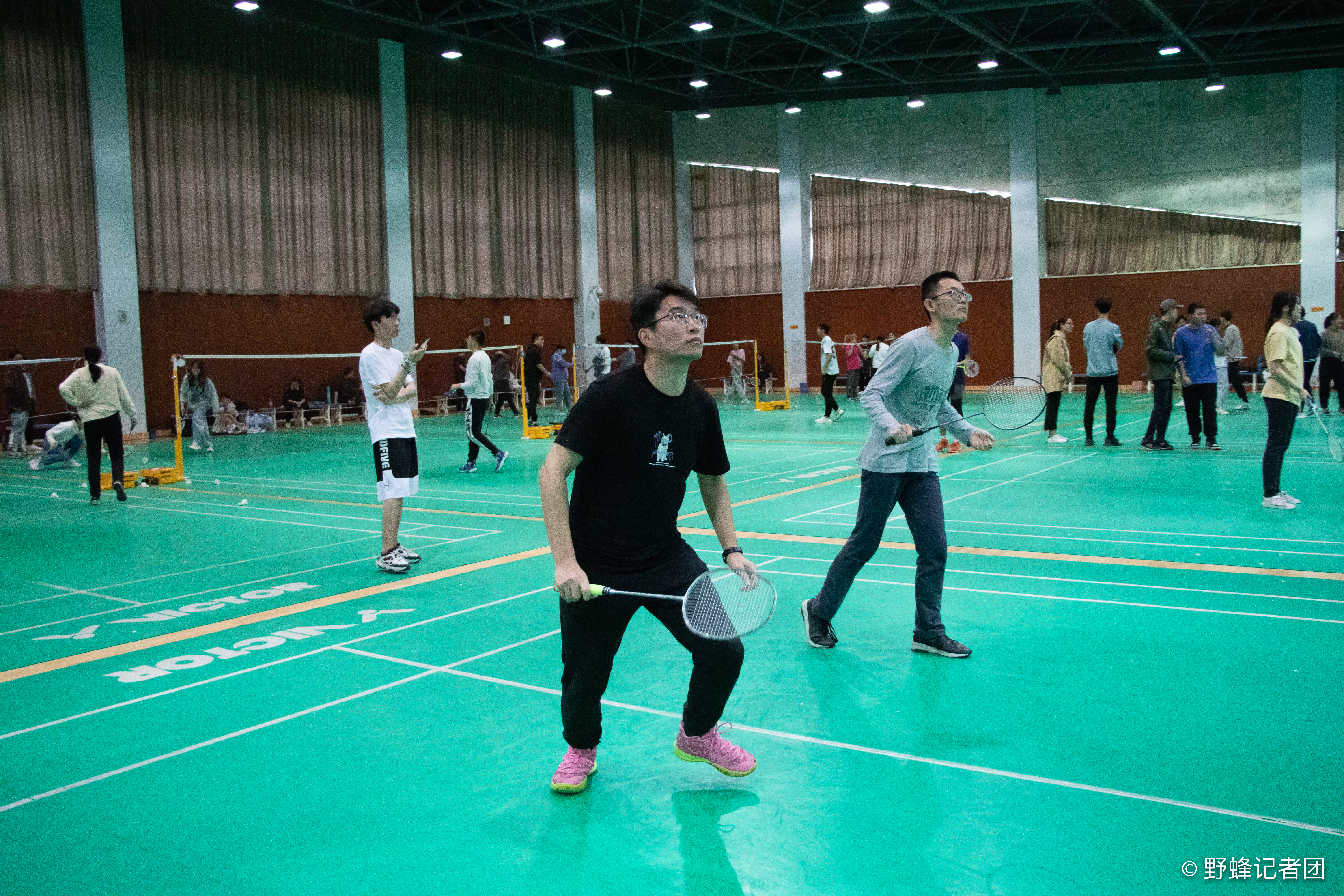 在比赛开始前,裁判和工作人员提前来到体育中心羽毛球馆,进行场地布置以及其他准备工作,参赛选手也陆续来到羽毛球场地进行热身活动。