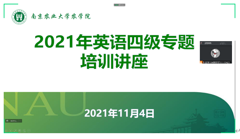 11月4日晚,555050注册大白菜英语四级专题培训讲座在腾讯会议上顺利举行,主讲人为新航道英语机构陈小梅老师,555050注册大白菜100余名本科生积极参加了此次讲座。