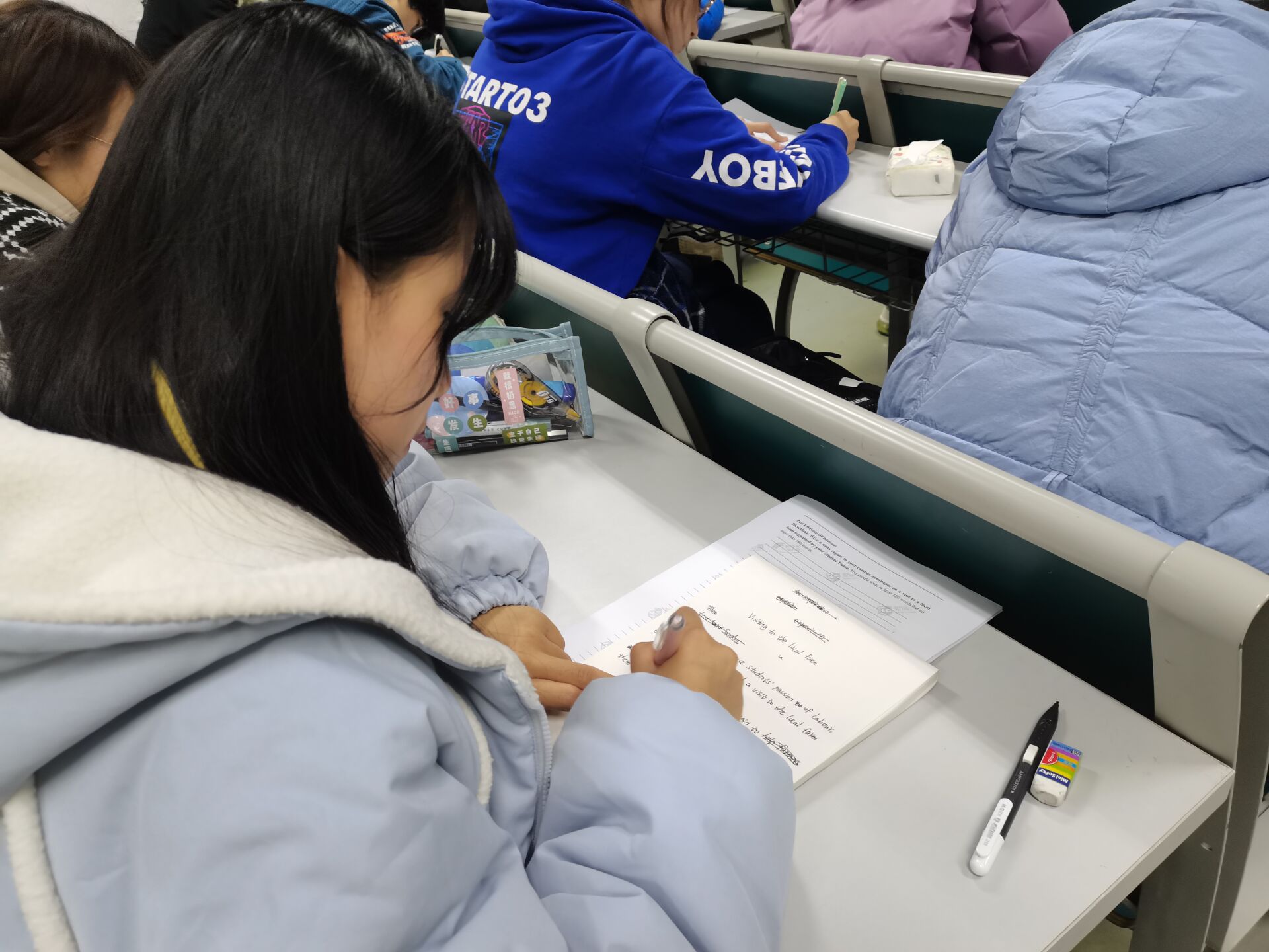 此次考试所用试题符合全国老员工英语四六级考试大纲标准,考试现场及流程全部按照英语四六级考试流程进行。考试期间,同学们严格的遵守考试流程,认真答题,检验近期的学习成果。