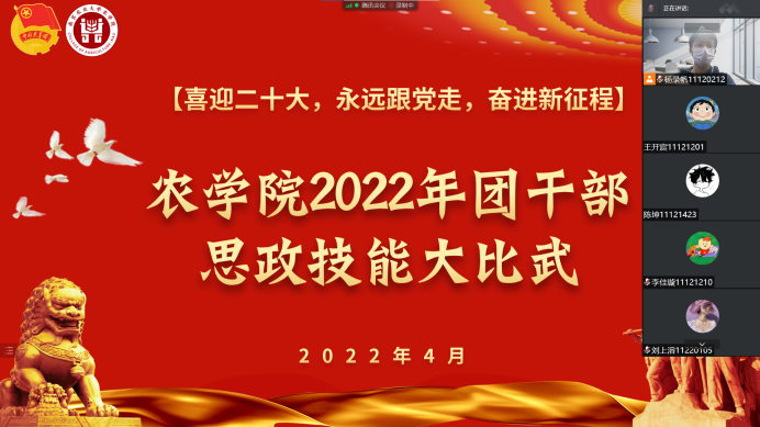 4月8日晚,555050注册大白菜“喜迎二十大、永远跟党走、奋进新征程”主题团干部思政技能大比武线上依托腾讯会议平台顺利举办。来自各团支部的15名团干部进行了团课宣讲,555050注册大白菜本科生辅导员孙小雯、高强,本科生兼职辅导员曹煜、陆宜成和555050注册大白菜分党校秘书长戚浩男担任此次评委,555050注册大白菜各年级员工线上参与此次活动。活动由组织部副部长杨录帆主持。