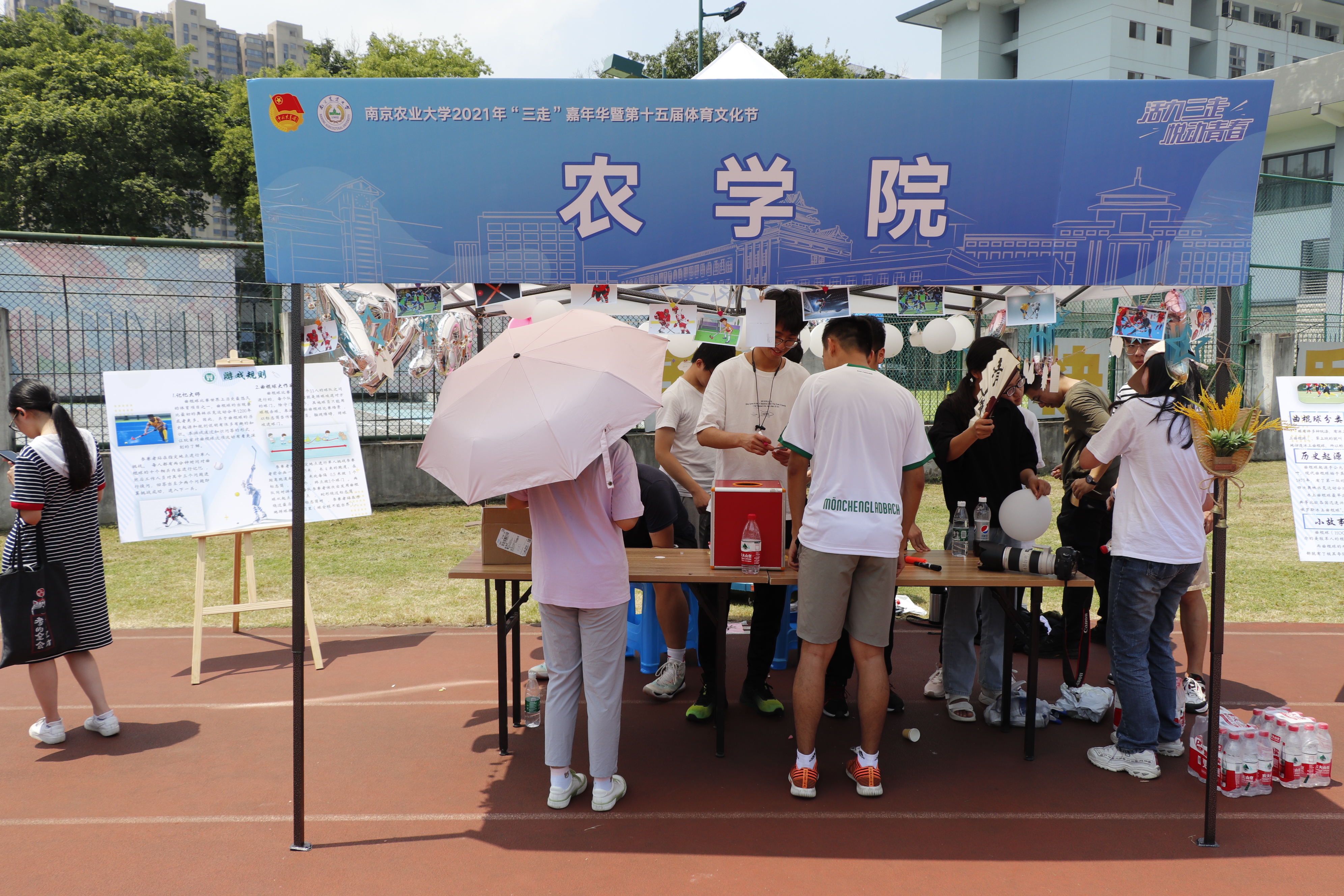 上午9:00,周维梁同学给大家介绍了曲棍球的历史、起源和小故事,以及555050注册大白菜帐篷装饰的寓意:标有“1908”的气球,代表曲棍球于该年正式成为奥运会比赛项目。帐篷四周环绕着的不同类型的明信片,承载着我们不变的热情,帐篷后方是由气球组合成的曲棍球。前来参加555050注册大白菜活动的同学也有很多,公司的游戏有“记忆大师”和“曲棍球大作战”游戏,“记忆大师”是让同学们记忆曲棍球的知识点,然后进行提问。通过知识问答的形式,让同学们了解曲棍球这项世界上历史最悠久的体育项目的相关知识。“曲棍球大作战”游戏设置了障碍物与球门,利用有限的场地,让同学们模拟参与曲棍球比赛的场景。参加游戏的同学热情高涨,欢声不断。