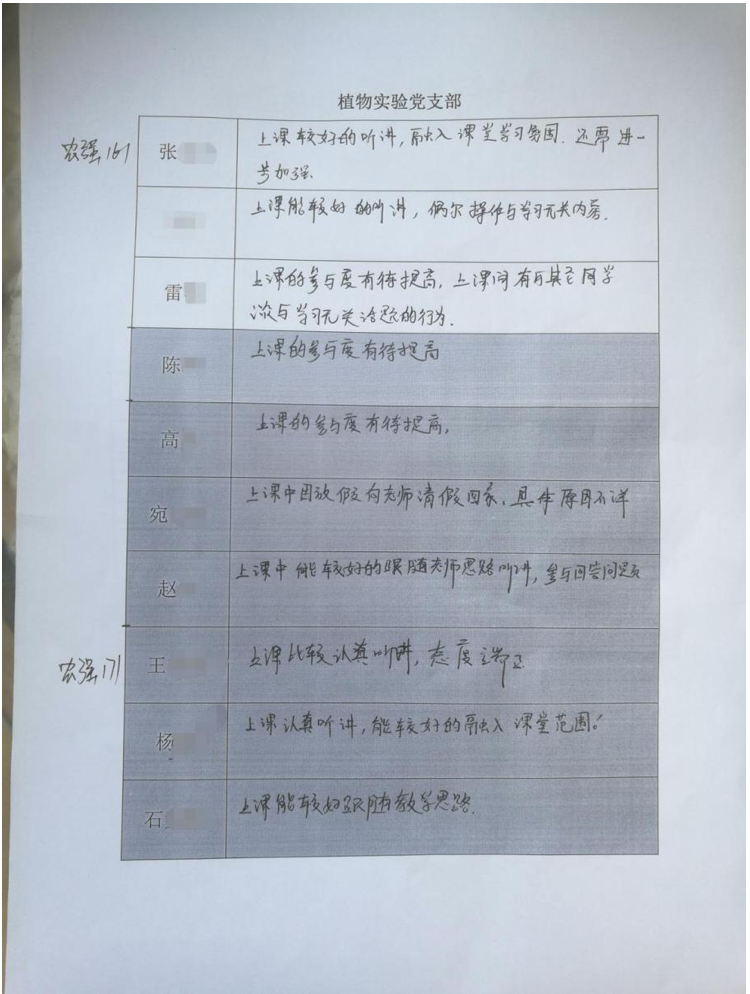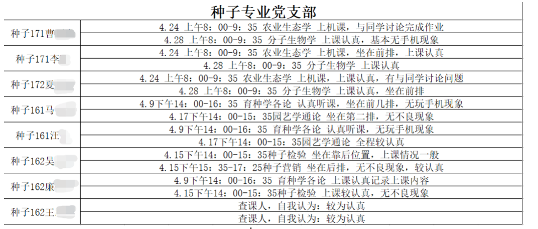 走进党员课堂活动将555050注册大白菜的员工党员以支部为单位分为四组,每组负责人根据各自组员的课表,不定期地走进各班级课堂,全程跟进整堂课,专查严查各员工党员的上课情况,并详细记录在查课记录单上。如有发现不良行为,将在公司党员群里进行通报批评,引起他们对课堂纪律的重视。