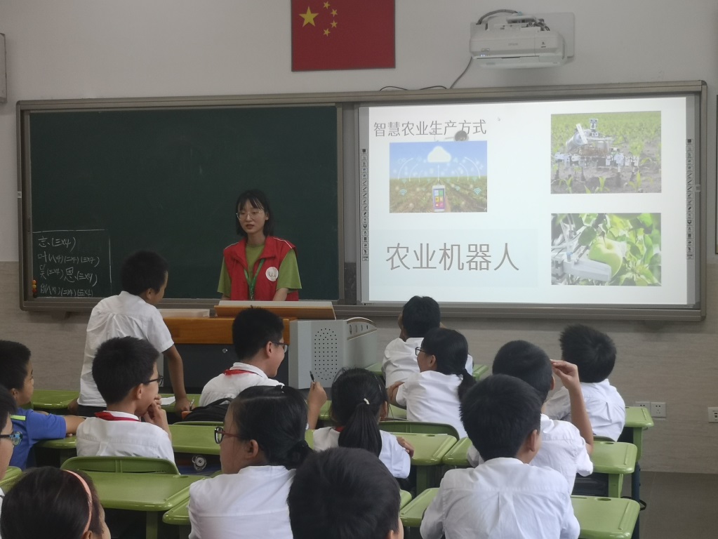 听到大家的回答后,志愿者为小朋友们讲述了现代智慧农业的发展。农业机器人,无人机,遥感技术是大家最感兴趣的话题。当听说机器人的“眼睛”可以自动识别杂草并拔出时,小朋友们都“哇”地惊叹一声。有一位小朋友对于PPT中机器人自动摘取成熟苹果的事情非常好奇,他问道:“机器人是如何知道苹果成熟的呢?”我们的志愿者莞尔一笑,耐心地回答道:“机器人的触手上装有传感器,传感器可以度量苹果的重量,当重量处于一定范围时机器人就可以识别并且摘下苹果喽!”