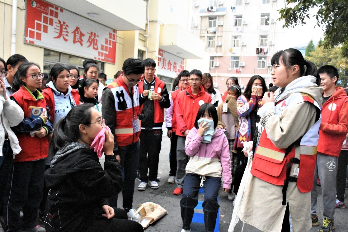 此外,消防演习活动结束后,校红会同学在现场讲解急救知识并演示多种紧急处理伤病方法,防患未然。